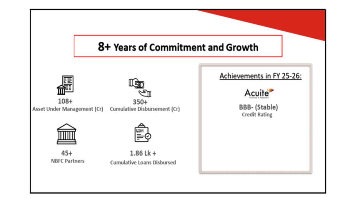 Over the past few years, the Company has demonstrated strong and consistent financial growth with clear year-wise improvements across all key parameters. The Net Worth has increased significantly from ₹20.67 crore in FY 2022–23 to ₹59.90 crore as of September 2025, reflecting a robust growth of 190%. Similarly, Assets Under Management (AUM) have expanded sharply from ₹14.61 crore in FY 2022–23 to ₹94.13 crore in September 2025, marking an impressive growth of 544%, indicating strong business expansion and customer acquisition. On the profitability front, Profit Before Tax (PBT) has improved from ₹2.86 crore in FY 2022–23 to ₹2.99 crore in FY 2024–25, while Profit After Tax (PAT) has remained healthy, growing from ₹2.05 crore in FY 2022–23 to ₹2.36 crore in FY 2024–25, and standing at ₹1.24 crore for the half year ended FY 2025–26. In terms of asset quality, the Company has shown notable improvement with Gross NPA reducing from 5.19% in FY 2022–23 to 2.71% in September 2025, and Net NPA declining from 3.94% to 2.44% over the same period. Overall, the year-wise performance reflects a well-balanced growth strategy supported by improving profitability and strengthening asset quality.